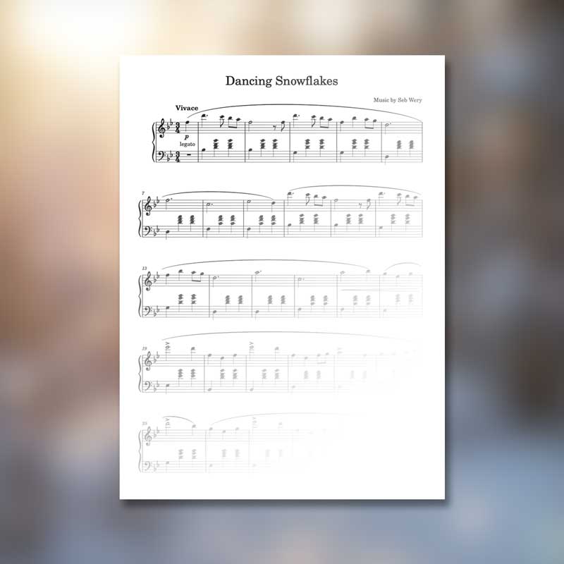 The original sheet music of ‘Dancing Snowflakes by Seb Wery in PDF format.